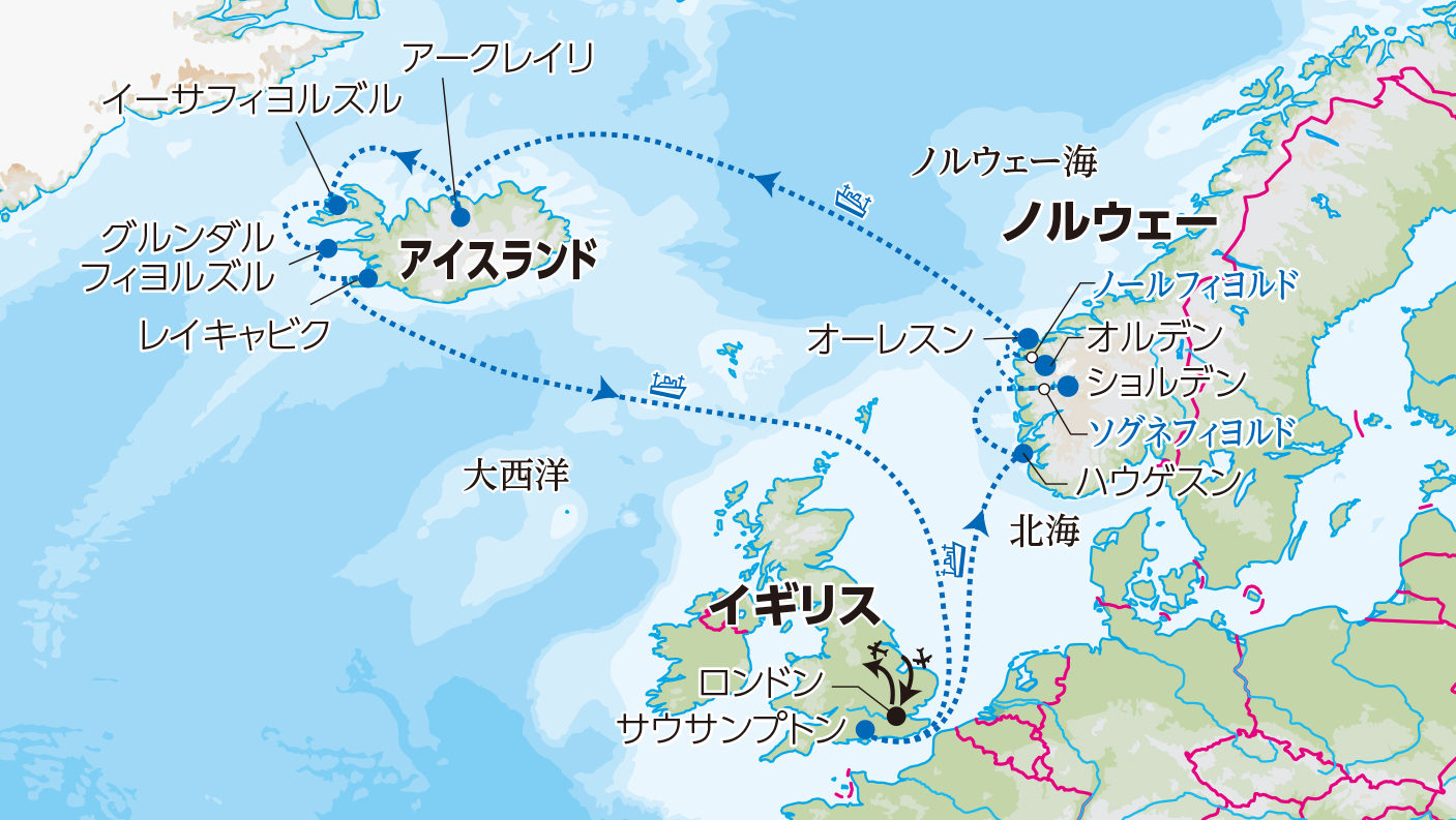 ■イスタンブール着後、航空機を乗り換え、ロンドンへ。 ■ロンドン着後、サウサンプトンへ。 ■午後、サウサンプトンにて「スカイ・プリンセス」に乗船します。 ■夕刻、ノルウェーに向けて出港します。 【14連泊】(スカイ・プリンセス:船中泊) |