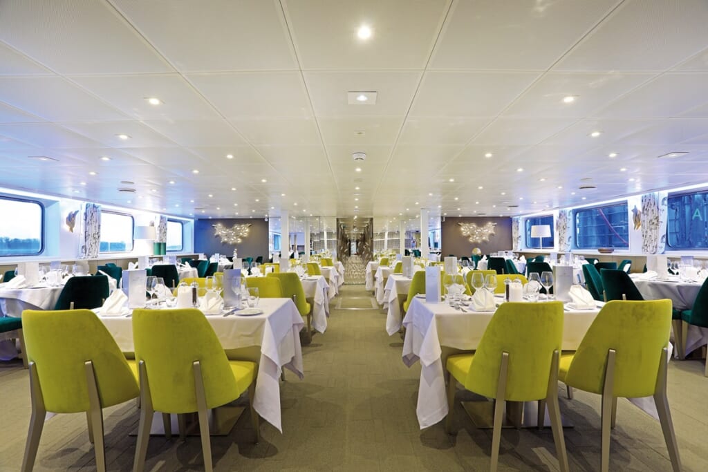 クルーズ中は、船内のレストランでシェフが腕を振るう、季節の食材に合わせたメニューも楽しみです。船内ではオールインクルーシブ制となり、いつでも飲み物を無料(一部の飲料は除く)でお楽しみいただくことができ、下船前の精算もスムーズです。