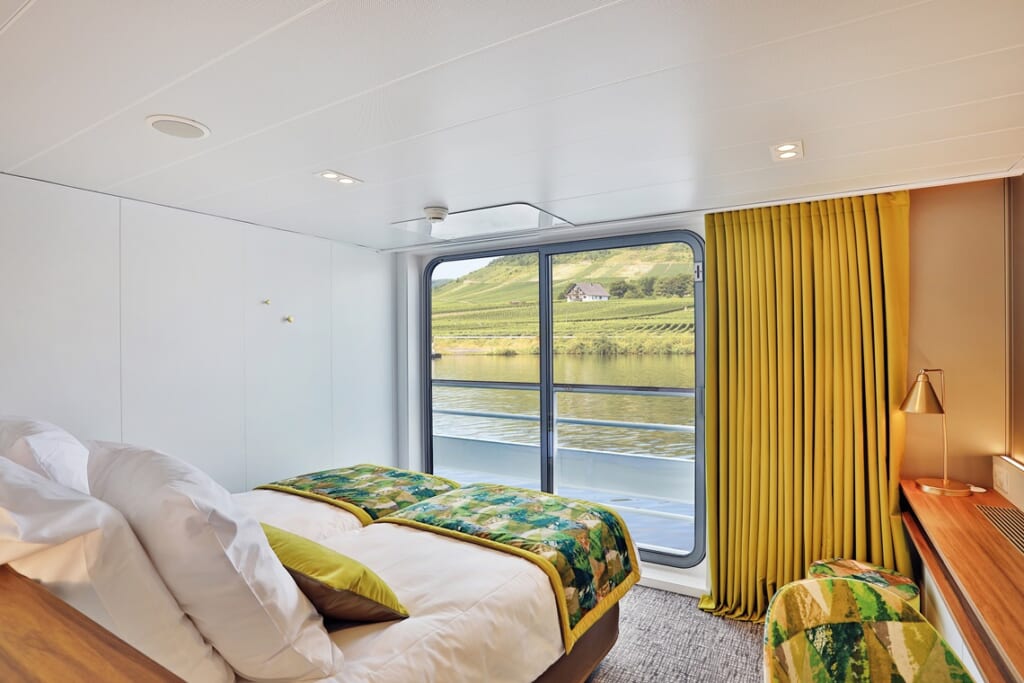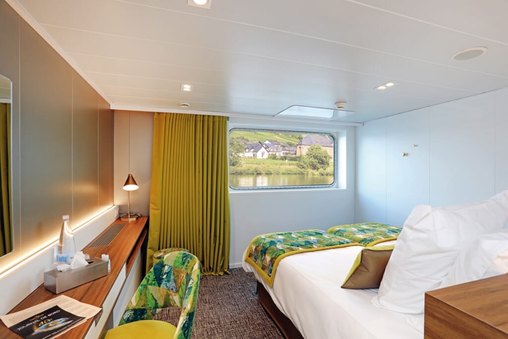 ■客室:メインデッキ:約14㎡(ツインベッド、シャワーのみの客室、 窓の開閉不可)/アッパーデッキ:約14㎡(ツインベッド、シャワーのみ、フレンチバルコニー(出窓)、窓の開閉可)