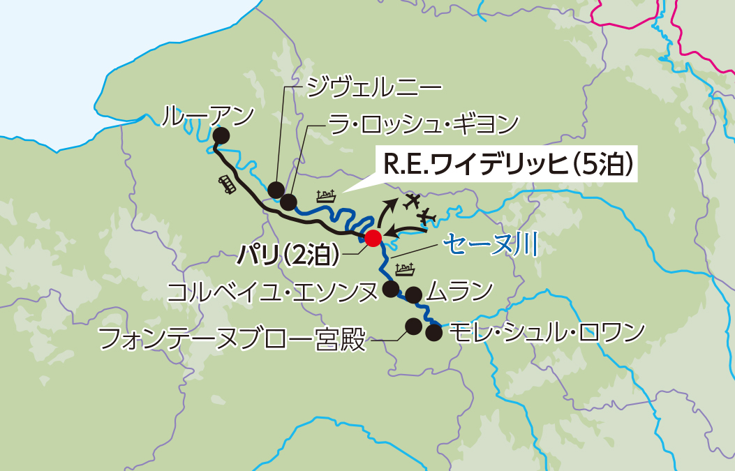 セーヌ川を巡る5泊6日の優雅な船旅へ。好評のクロワジ社のクルーズシップの中でも希少な外輪船を利用することで、喫水の浅い河川でも航行可能となり、通常のクルーズでは訪れることの少ないセーヌ上流の小さな村々を訪ねます。印象派の画家たちが愛した風景や、歴代フランス王が暮らしたフォンテーヌブロー宮殿など、イル・ド・フランスの豊かな歴史と文化に触れる時間へとご案内します。航路の最初と最後、計2泊はパリに停泊し、下船後にもパリで連泊します。ジヴェルニーでモネの庭を散策した翌日に、パリのオランジュリー美術館にて大作《睡蓮》を鑑賞。題材となった庭と描かれたアトリエ、そして名画を続けて訪ねる、贅沢な芸術鑑賞体験をお楽しみいただけます。