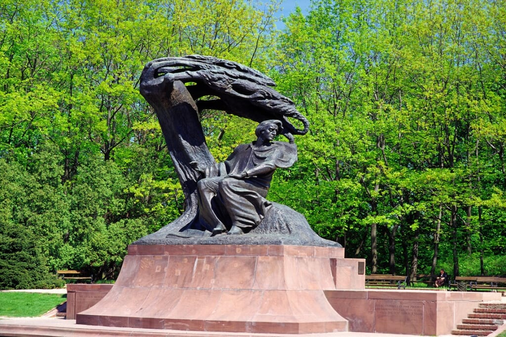 市民の憩いの場、ワジェンキ公園のショパンの像