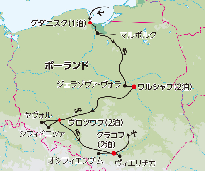 中世から現代まで、歴史の軌跡と豊かな文化が息づくポーランド。一度この国を旅してみると、その歴史の奥深さに驚かされます。戦争の痕跡だけでなく、中世の歴史の舞台となった古都クラコフ、水の都ヴロツワフ、そしてスケールに圧倒されるヴィエリチカ岩塩抗など、見どころが豊富で訪れる人々を魅了しています。今回は一筆書きで巡れるよう、旅の始まりを北部の港町グダニスクとし、南部のクラコフまで辿る日程といたしました。これにより北部から南部へと無駄のないルートで向かうことができ、バスでの移動時間を軽減しています。また、なるべく連泊中心の日程とし、この国が誇る世界遺産の数々、各町での散策をゆっくりお楽しみください。