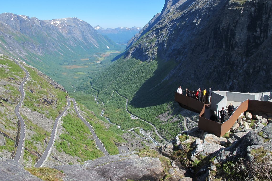 「トロルの梯子道」という意味のトロルスティーゲン。展望台からは、急勾配の斜面に刻まれた11のヘアピンカーブを持つ道路と、氷河によって浸食された壮大なU字谷が眼下に広がります。