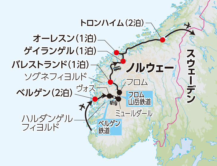 - ノルウェーの絶景ルートを巡り、爽やかな初夏の北欧を満喫します。