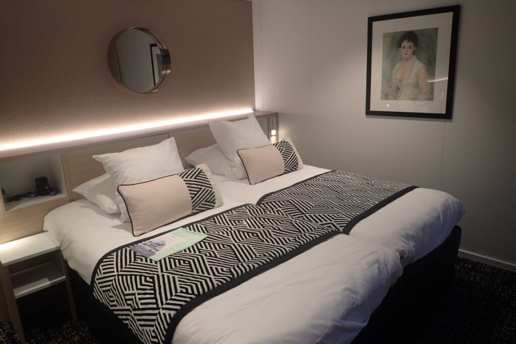 ■客室:メインデッキ:約16.5㎡(ツインベッド、シャワーのみの客室、 窓の開閉不可)/アッパーデッキ:約16.5㎡(ツインベッド、シャワーのみの客室、フレンチバルコニー(出窓)、 窓の開閉可能)