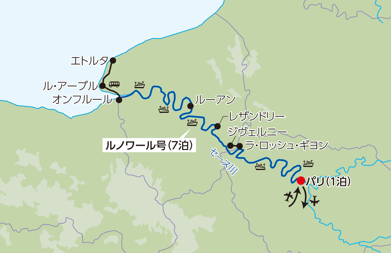 ■深夜、航空機にてパリへ。 ■着後、『印象、日の出』を所蔵するマルモッタン・モネ美術館、『ラヴァクールの日没』を所蔵するプチ・パレ美術館へご案内します。(注1) ■夕刻、セーヌ川のクルーズ船「ルノワール号」に乗船します。 ■夜、パリのナイトクルーズをお楽しみください。(注2) 【7泊8日クルーズ】(船中泊:パリ停泊) |