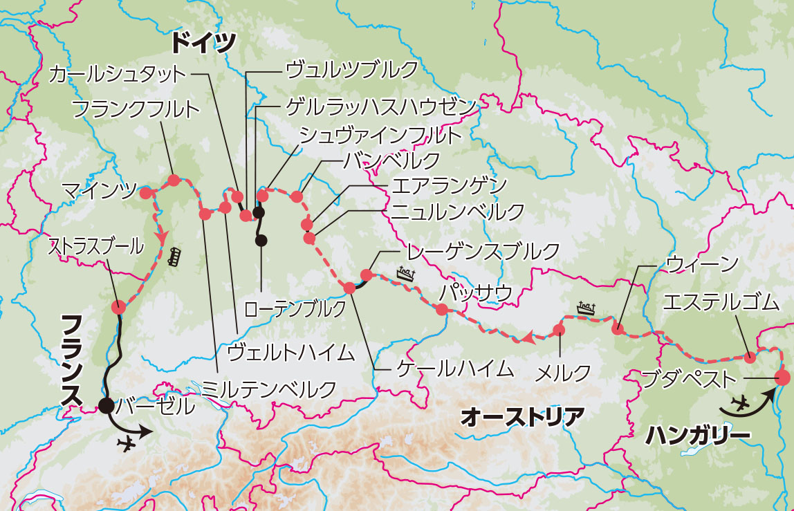 - ドナウ、マイン、ラインの3つの河川を、ゆっくり12泊13日のクルージングで楽しみます。