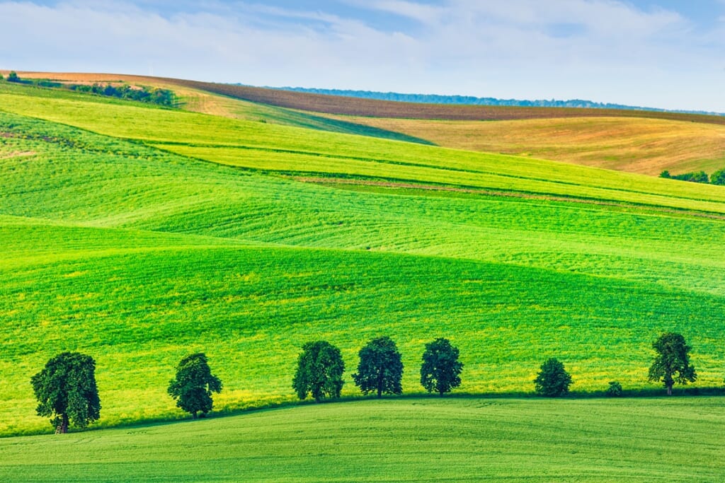 キヨフ近郊に広がる、波打つような丘陵の大絨毯。初夏のこの時期は特に美しい緑の大パノラマが広がります。中世の街並みだけではなく、チェコの牧歌的で心温まる田舎風景に出会えます。バスの車窓から、緑のグラデーションを目に焼き付けてください。