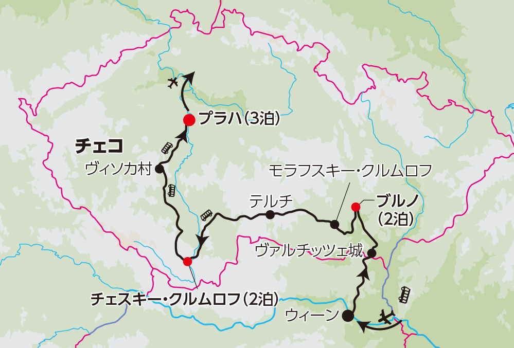 ■着後、航空機を乗り換え、ウィーンへ。 ■着後、バスにて南モラヴィア地方へ。 ■午後、世界遺産の●ヴァルチッツェ城を見学。 ■その後、ブルノへ。途中、キヨフ近郊の丘陵地帯ドライブを楽しみます。 【2連泊】(ブルノ泊) |