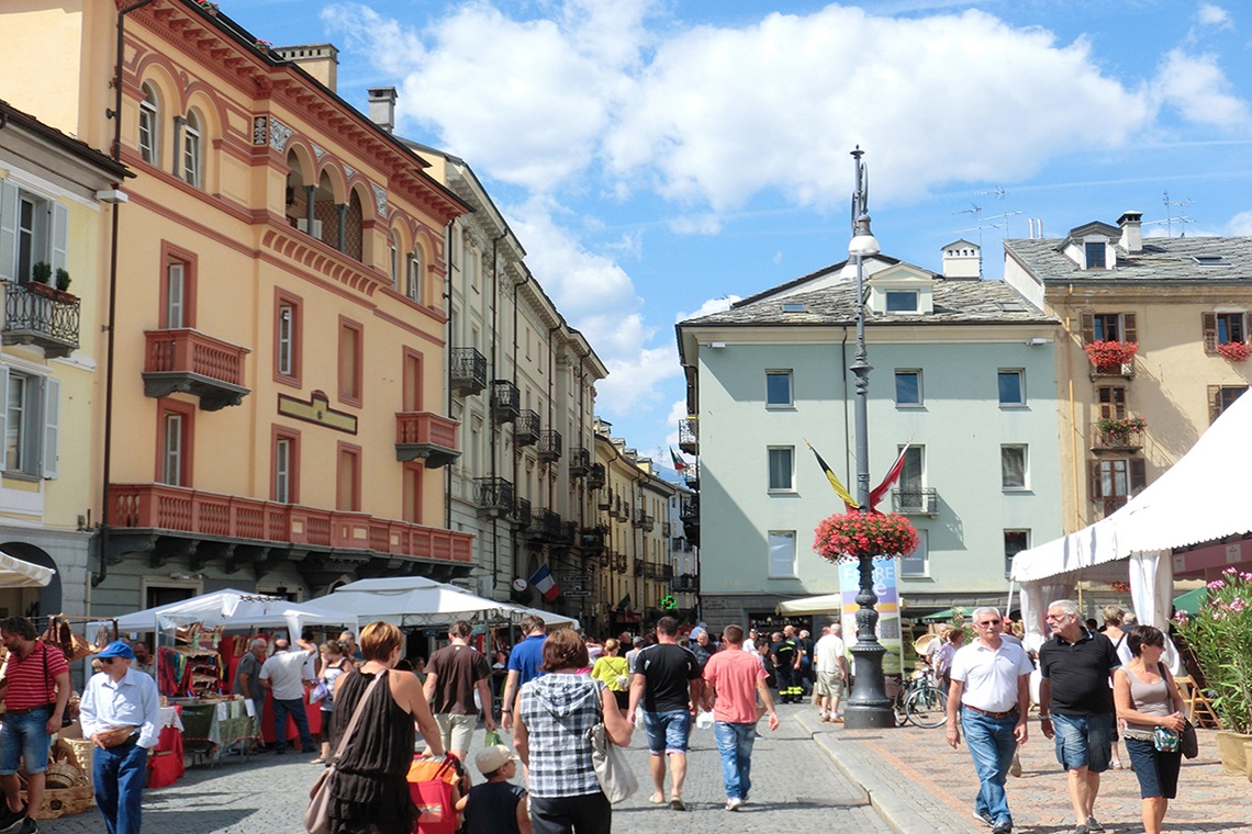アウグストゥス帝の時代に遡る古代ローマ起源の都市アオスタは、フランスやスイスへ抜ける戦略的拠点としてローマ帝国が重要視していた町でした。その遺構は現在にも残り、小さな町の中で古代劇場跡や凱旋門が人々の生活と共存しています。パステルカラーの建物が並び、木彫りの工芸品や名産のチーズが並ぶお店を覗きながら歩くのが楽しい町です。