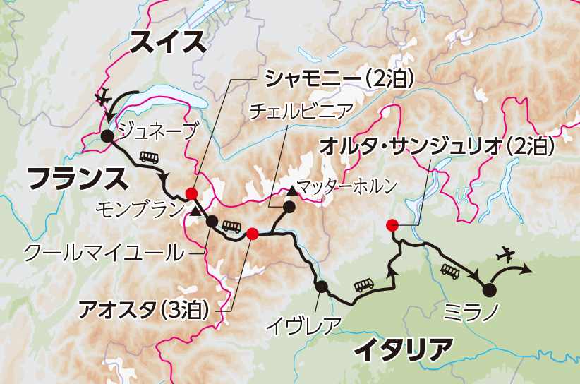 (注1)悪天候によりロープウェイが運行されない場合は、専用バスにてアオスタへ向かいます。また、状況により前日にご案内する可能性もあります。