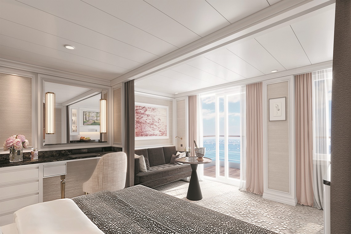 2020年に就航したセブンシーズ・スプレンダー。全373室、すべてバスタブ&バルコニー付きスイートタイプです。オールインクルーシブなど、クルーズ顧客の快適さを追求したサービスはクルーズファンから高い評価を受けています。このたびは、セレニティ・スイートキャビン(海側・バルコニー、バスタブ付、38.5~43㎡)の客室をご用意しました。
