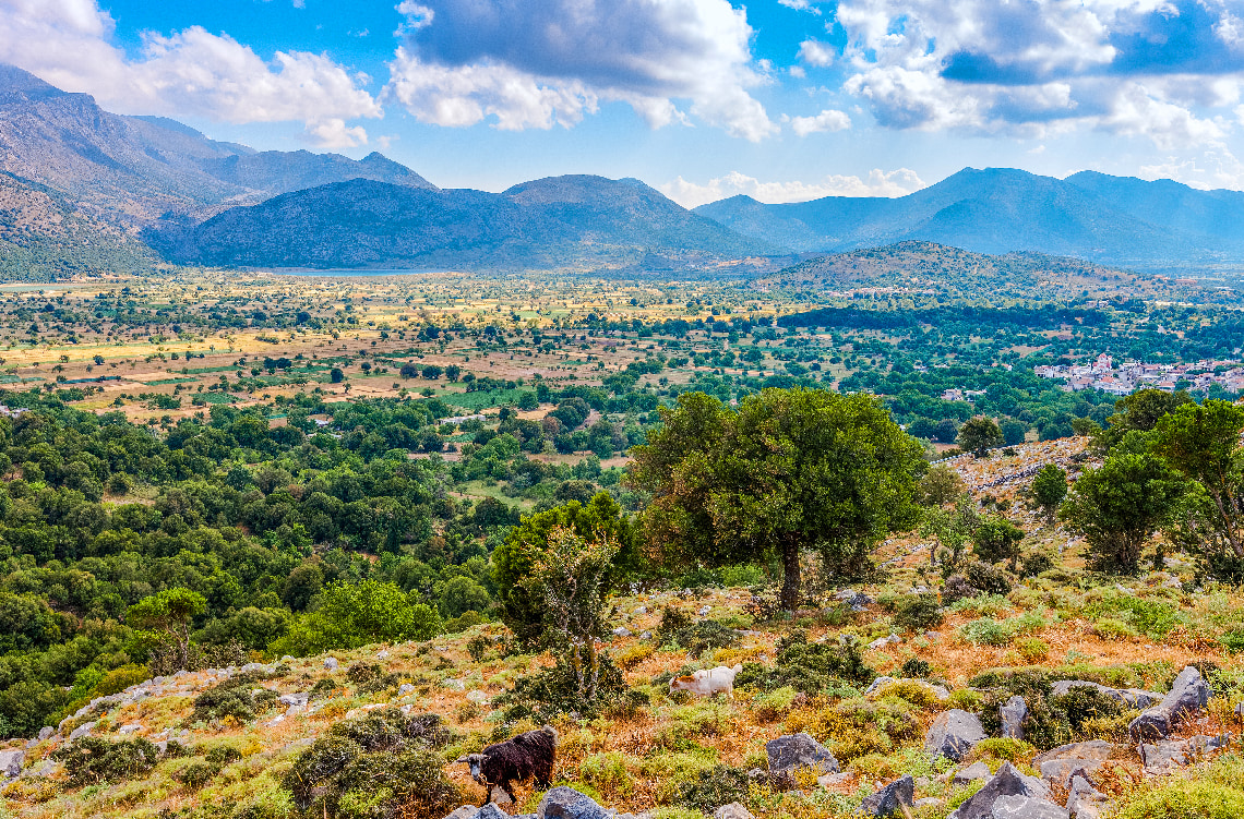 クレタ島ではラシティ高原へのドライブを楽しみます。ディクティ山はクレタ島の3つの山脈の中で最も東に位置し、標高900mの高さを誇ります。道中では、豊かな田園風景が広がり、谷間に点在する風車が独特の景観を作り出しています。これらの風車は、かつて農業用水を汲み上げるために使われていたもので、歴史と自然が調和した美しい風景を堪能できます。