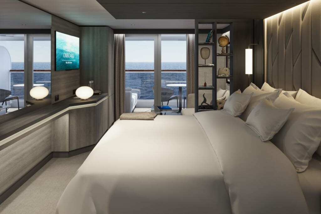 エクスプローラ ジャーニーの3隻目の新造船となる「エクスプローラⅢ」は、2026年夏(8月上旬)の就航予定。463ある客室は、すべてオーシャンフロントでテラス付きのスイート仕様。客室数は「Ⅱ」から2キャビン増えただけですが、船体は約9,000トン大きくなり、一人当たりの占有面積も大きく、さらにゆったり度が増す予定です。上質なヨットに乗船しているようなアットホームさとエレガントさを兼ね備え、乗客数とスタッフ数の比率は1.25:1とほぼ1対1で業界最高水準のサービスとホスピタリティの高さを誇ります。