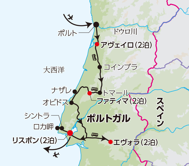 (注1)航空機の関係でリスボン空港の利用となる場合には、ポルトの観光は3日目にご案内する場合がございます。その場合、3日目のアヴェイロでの自由行動の時間はなくなりますので、ご了承ください。