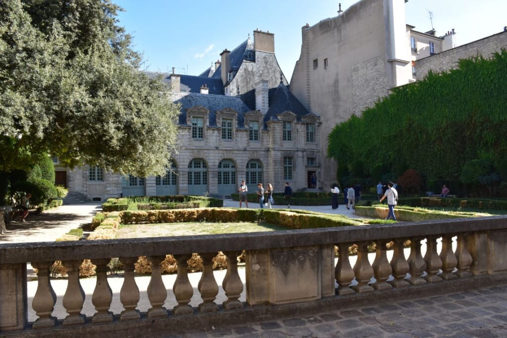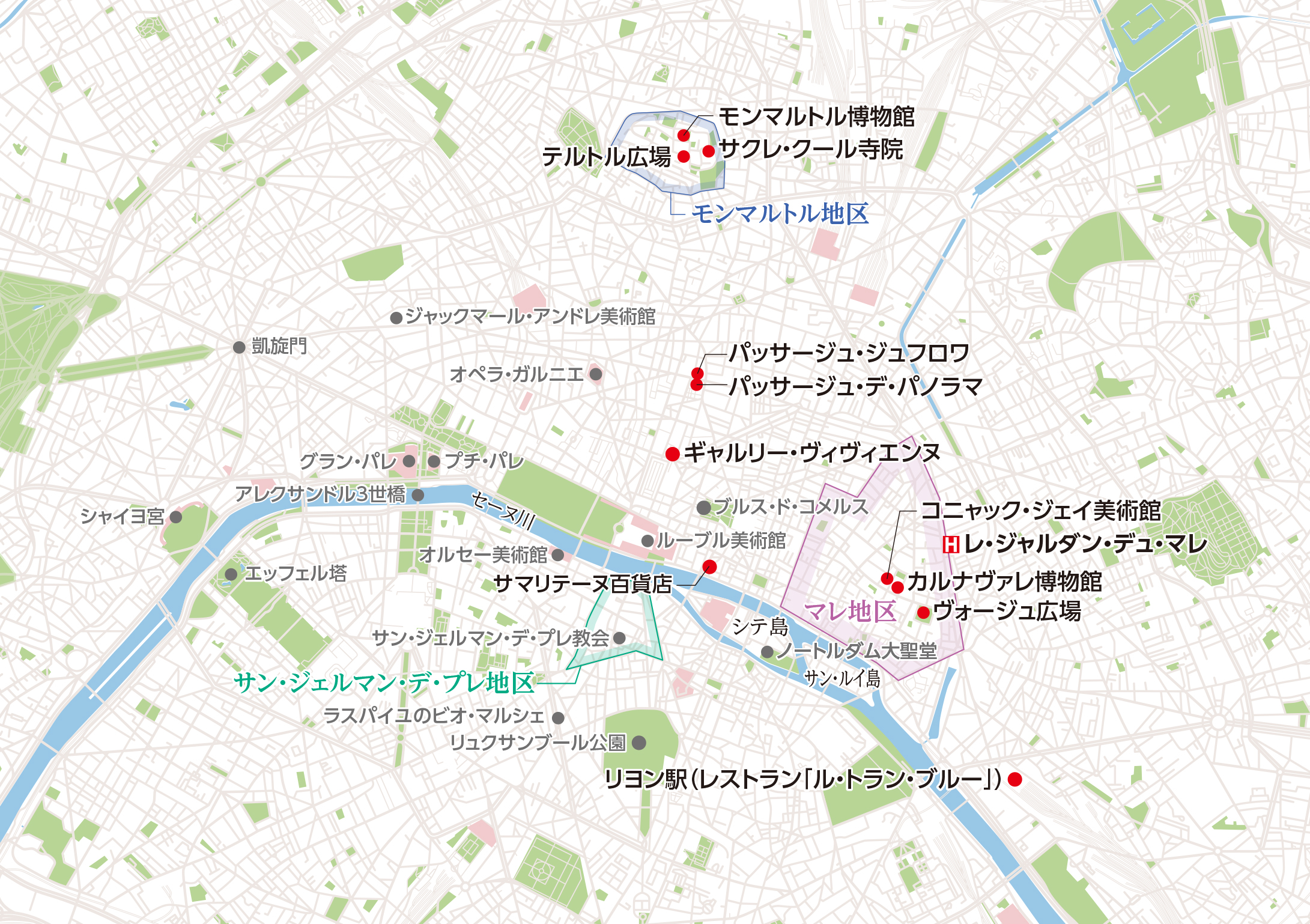 ■午前、マレ地区の散策。ヴォージュ広場、19世紀後半の看板がずらりと並ぶギャラリーもある●カルナヴァレ博物館、19世紀のブルジョワの邸宅を利用した●コニャック・ジェイ美術館にご案内します。