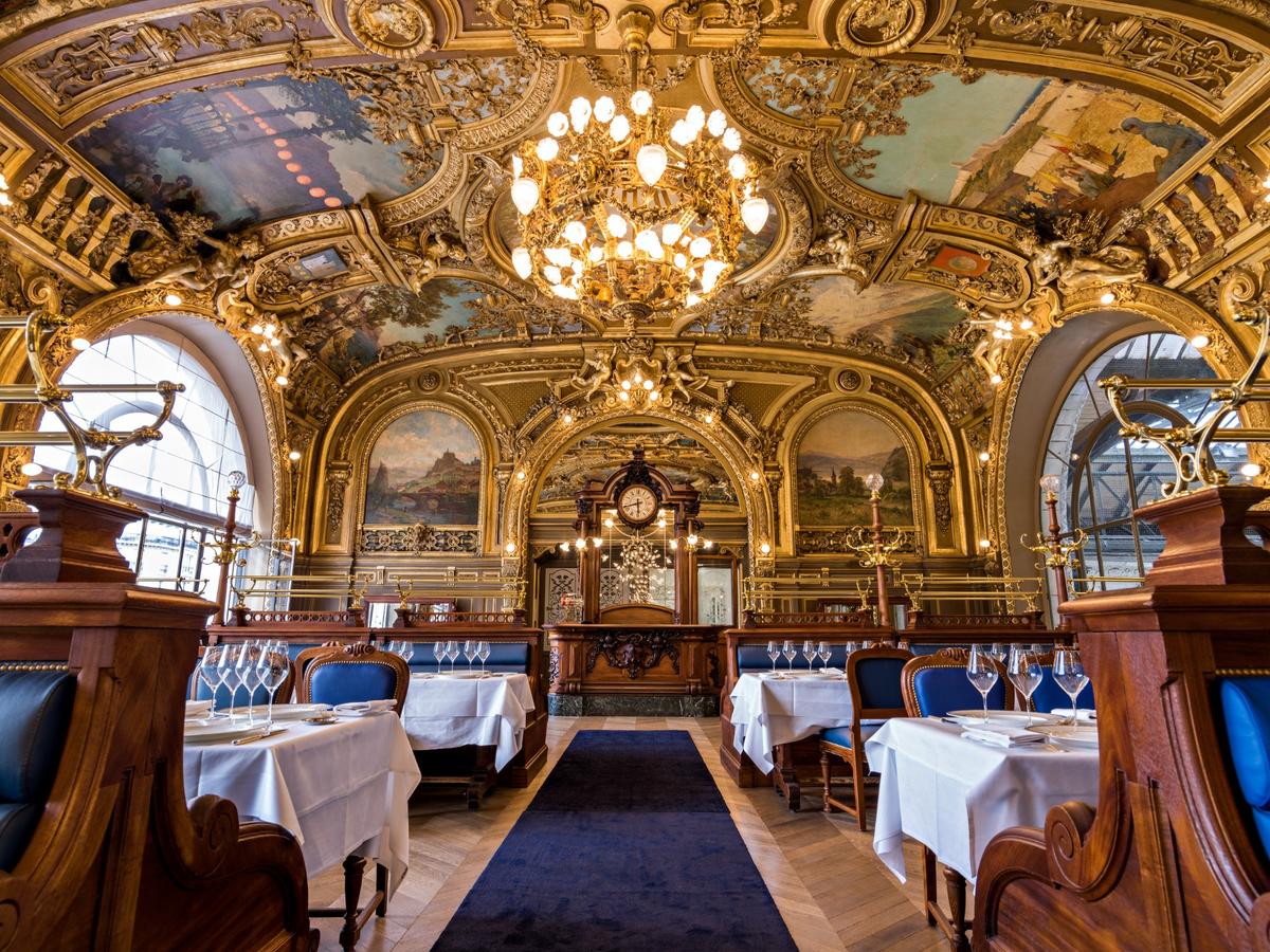 1901年開業、パリ・リヨン駅構内にある豪華絢爛なレストランで、天井画や金箔装飾が施されたベル・エポック様式の内装は、まるで宮殿のよう。歴史的建造物にも指定され、数々の芸術家や著名人に愛されてきた名店です。フレスコ画とシャンデリアが美しい贅沢な空間でパリ最後の夜を飾ります。