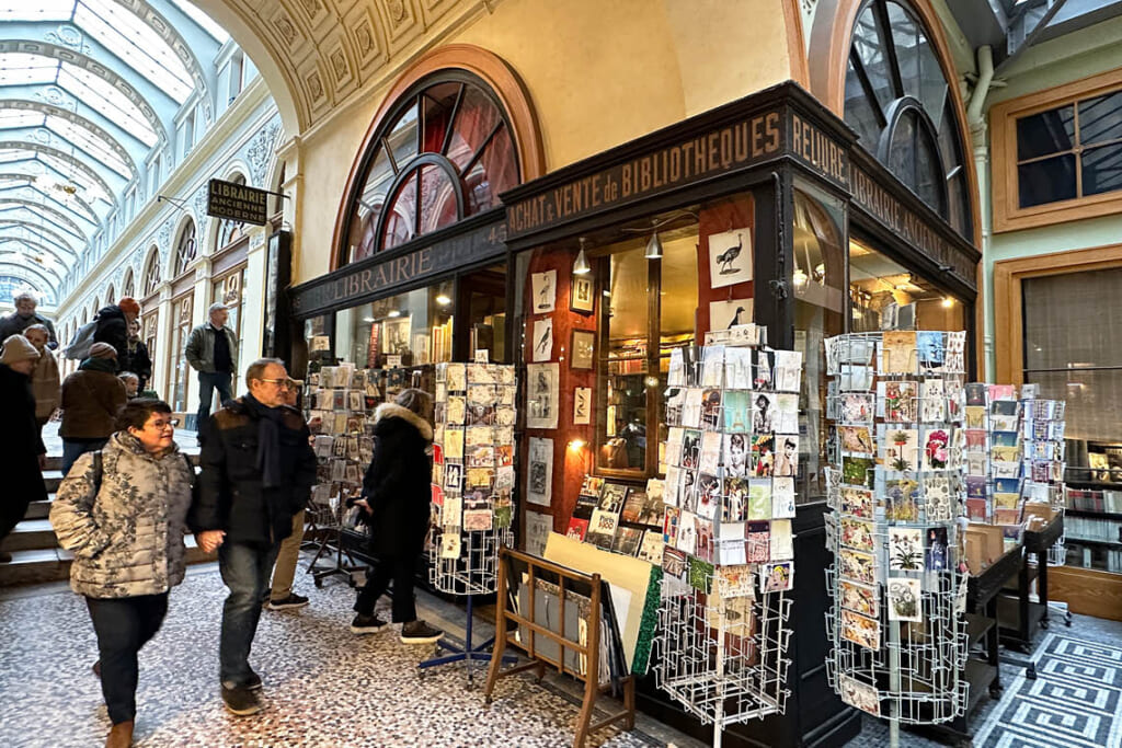 ギャルリー・ヴィヴィエンヌではモザイク床と古書店や高級ブティックが調和しています