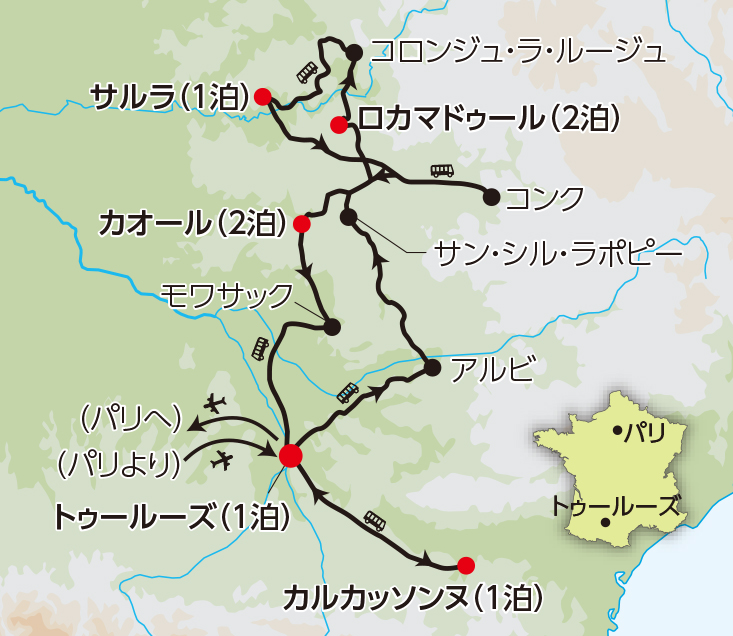 羽田空港00:05発 パリ08:00着/09:30発 トゥールーズ10:50着 カルカッソンヌ12:30着