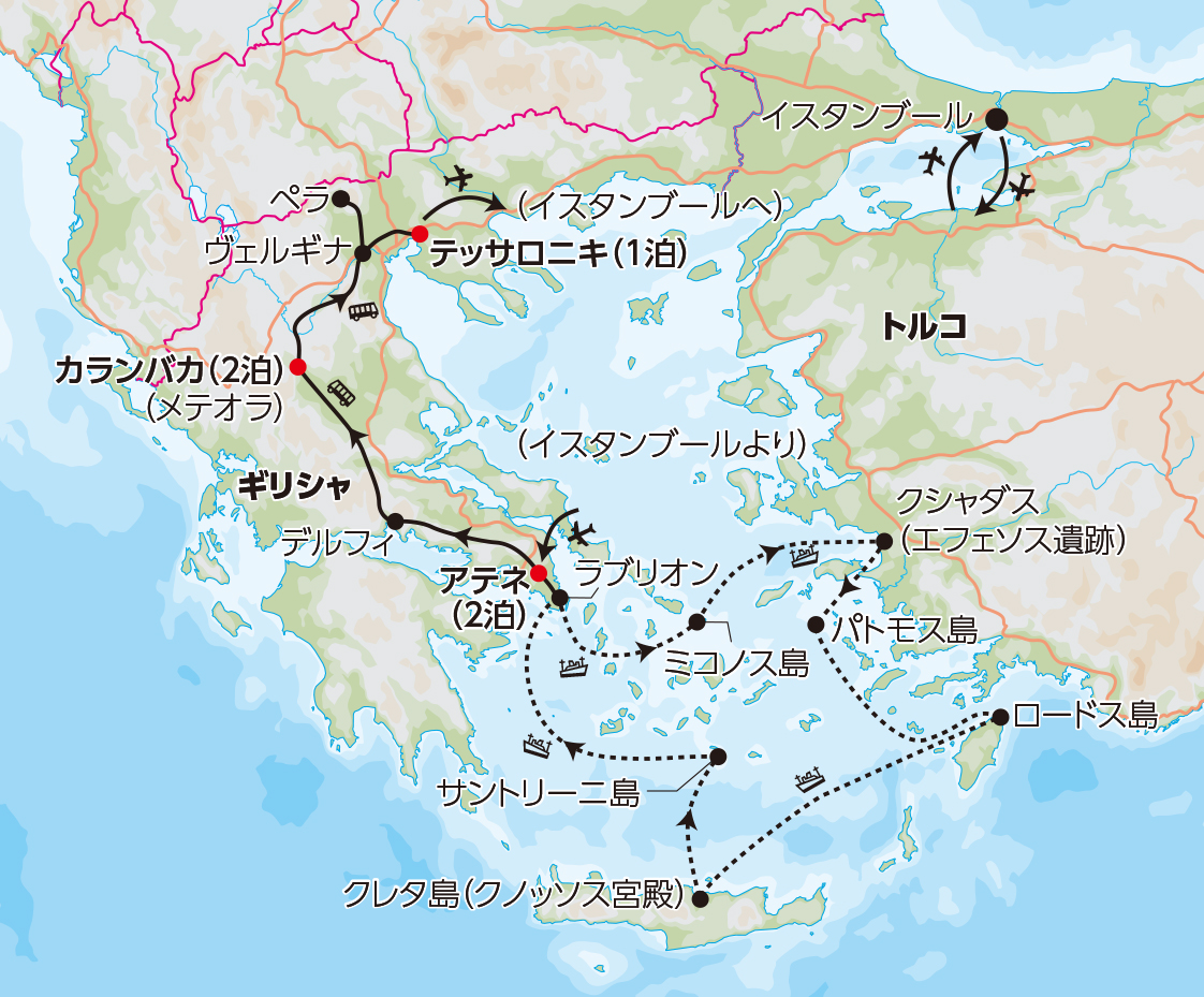 (注1) エーゲ海クルーズは天候等により、船長の判断で寄港地や滞在時間を変更する場合がございます。その場合、返金はございません。またエーゲ海クルーズはコンパクトな日程で島々をめぐる為、滞在時間が限られますこと、また、通常のツアーよりも慌ただしいスケジュールとなりますこと、あらかじめお含みおきください。尚、日程5~7日目の下船観光は船のエクスカーションを利用するため、他のお客様との混乗でのご案内となります。