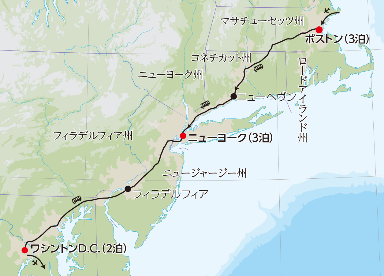 - ボストン、ニューヨーク、ワシントンD.C.をバスで一度に巡る旅。それぞれ連泊し、適度な自由時間も設けました
