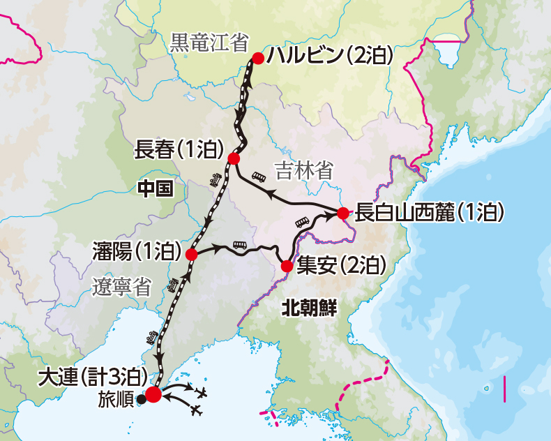 (注2)ハルビンの到着時間によっては、松花江の遊覧は9日目にご案内する場合があります。