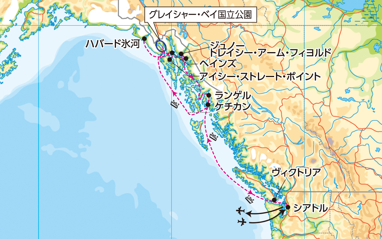 ■朝、アラスカの州都ジュノーに寄港します。アラスカの歴史と沿岸部の先住民族を紹介する●州立博物館へご案内します。 ■午後、出港まで自由行動。 (船中泊) |