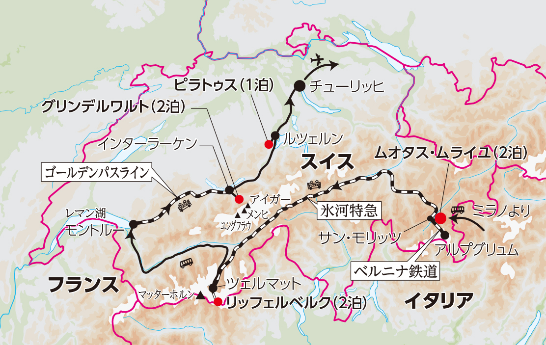 スイス最大の魅力は何といっても雄大な山並みにあるでしょう。アイガー、メンヒ、ユングフラウの三大名峰、登山家の憧れマッターホルンなど、数多くの美しい山々で知られています。その山景色を楽しむ、究極の方法の一つが山岳ホテルでの宿泊と言えるでしょう。このコースで利用する3つの山岳ホテルは、いずれも異なる名峰に囲まれ、登山列車など山岳交通を利用しなければたどり着くことは出来ません。日中こそ多くの観光客で賑わいますが、終電後から始発前の時間帯は宿泊客だけが景色を独占する何とも贅沢なひと時となります。また、息をのむような朝焼けや夕景色が見られるのも宿泊者だけ。ホテルからご覧いただくアルプスの絶景は一生心に残る思い出となることでしょう。あわせて、話題の氷河特急プレミアム車両「エクセレンスクラス」と2022年に新車両として生まれ変わった「ゴールデンパス・エクスプレス」の18席限定のプレステージクラス乗車もお楽しみください。