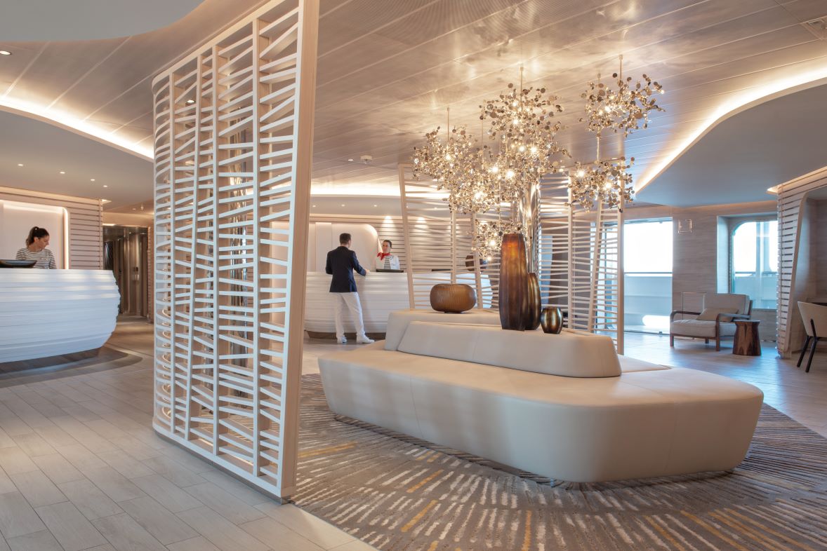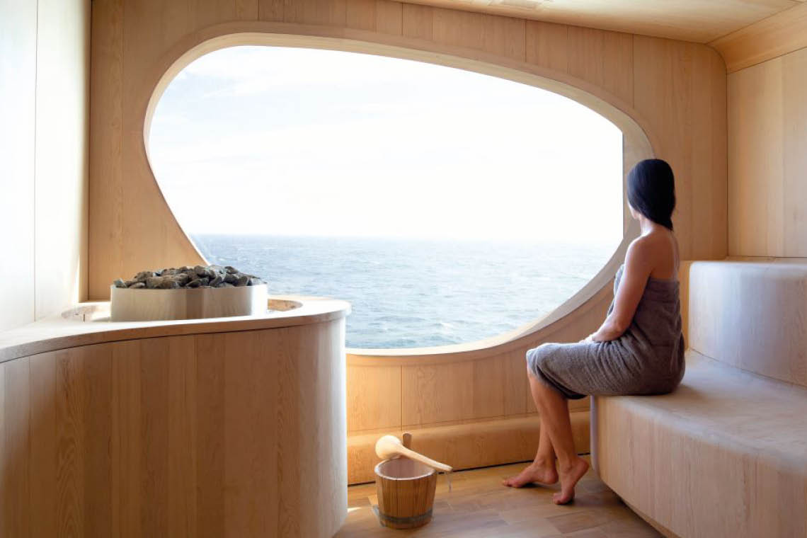 落ち着きのあるベージュやブラウンを基調にした「リラックスできる高品質な内装」が乗船客を迎えます。客室をデザインしたのは、日本でも高級洋菓子店の内装を手がけるなど世界的に活躍する仏人デザイナーのジャン・フィリップ・ニュエル氏。室内のアメニティーはエルメスで統一されています。