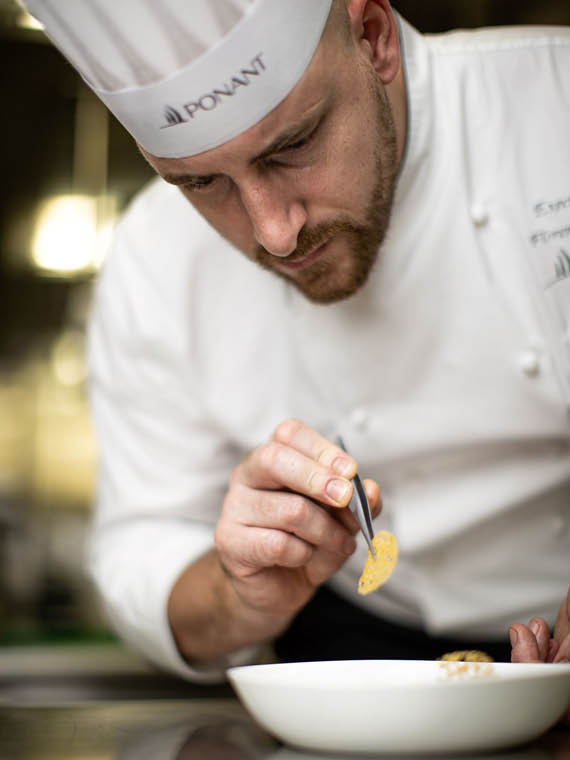 ポナンクルーズでは部屋のミニバーをはじめ、乗船中のドリンク(一部を除く)などが含まれているオールインクルーシブスタイルとなっています。食事は各地の食材を活かしながら、アラン・デュカス氏監修のこだわりの料理です。フランス流の洗練されたサービスや食事をお楽しみください。
