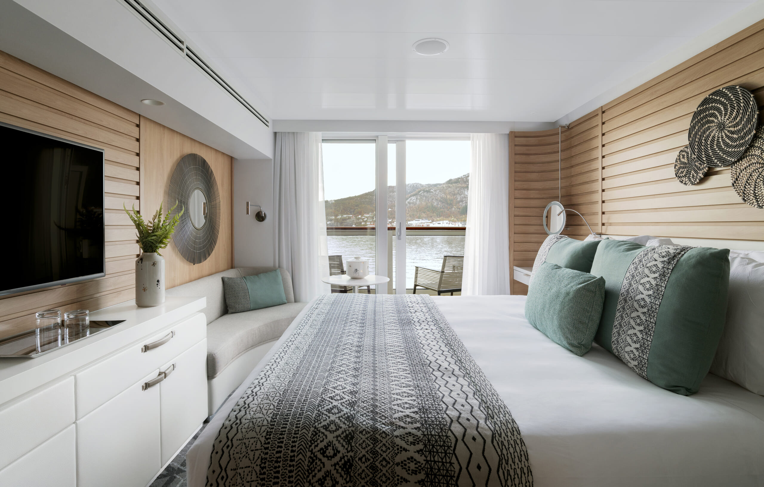 1万トンクラスの小型船ながら、白と木材を基調とした落ち着いた快適な客室は明るく開放的な雰囲気。このサイズの船としてはゆったりとした最低でも21㎡~の広さがあり、小物やアメニティもフランススタイルで高品質です。