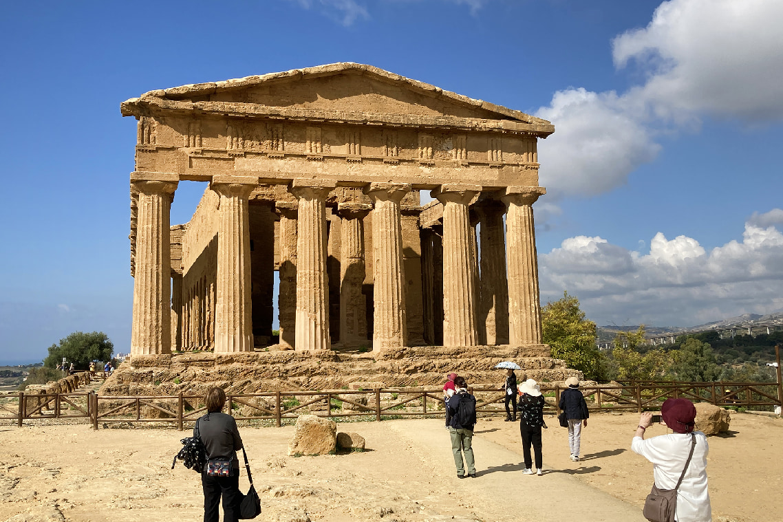 アグリジェントの「神殿の谷」は、シチリア随一の古代遺跡。ほぼ完全な姿をとどめるコンコルディア神殿は、列柱の一本一本に刻まれた風雨の痕跡が2500年の時の重みを静かに物語ります。遠くに地中海を望み、足元には古代の石畳、周囲にはオリーブとアーモンドの木々。太陽の方位を計算して建てられた神殿に立つと、宗教建築でありながら都市の誇りと富、当時の天文学や技術の粋が凝縮された「聖域」であったことに気づかされます。