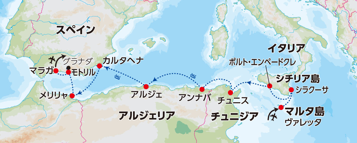 - マルタとシチリアから北アフリカ、イベリア半島の沿岸を訪ねるユニークな航路