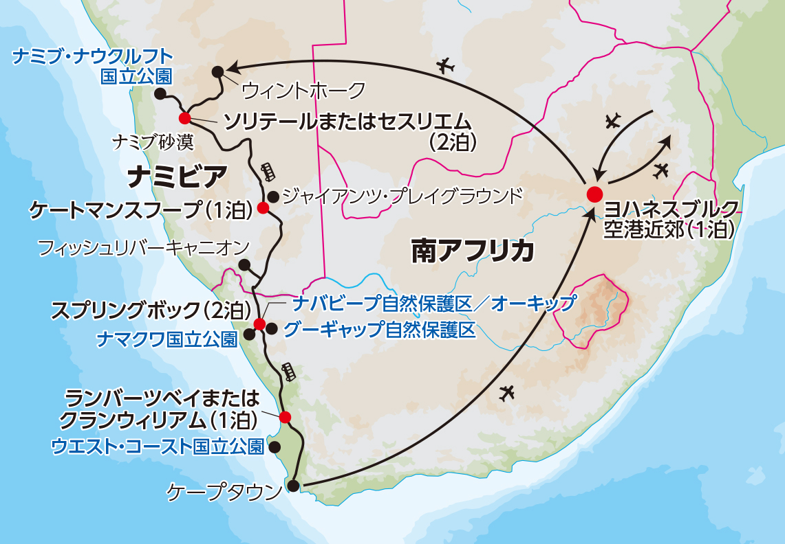 香港00:45発 ヨハネスブルク07:40着/10:40発 ウィントホーク12:50着 ナミブ・ナウクルフト国立公園近郊ソリテールまたはセスリエム18:00着