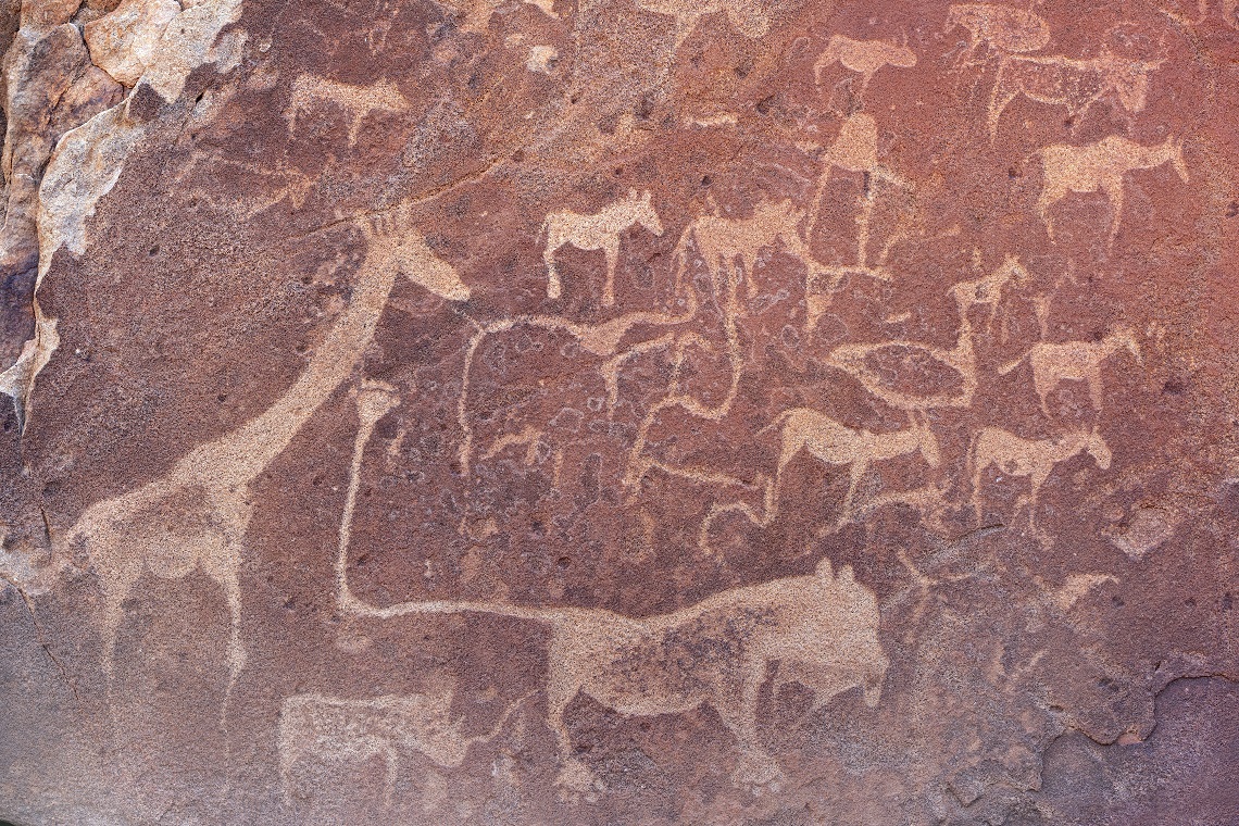 トゥウェイフェルフォンテーンに残る岩絵はその数2,000点以上あり、アフリカ大陸で最も集中して残っている場所のひとつです。先史時代の生活や信仰を知る貴重な遺跡として、ナミビア初の世界文化遺産に登録されました。