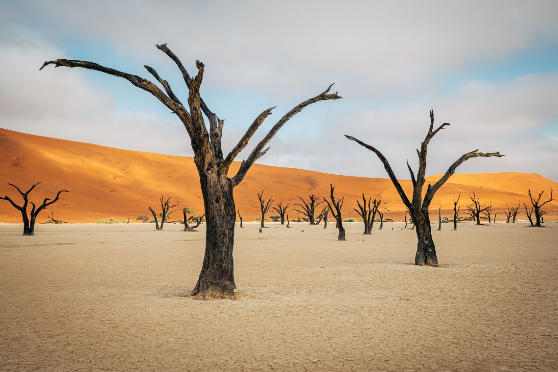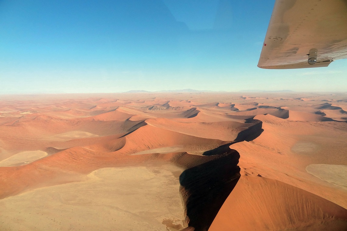 ナミブ砂漠の象徴的な景観を、空からも地上からも楽しみます。ナミブ・ナウクフルト国立公園近郊に宿泊し、朝の澄んだ光、そして日中へと、表情を変える砂丘地帯を間近にご覧いただきます。大砂丘デューン45の美しい曲線、白い塩湖に立つ古木と赤い砂丘が織り成すデッドフレイの静謐な光景を巡り、さらにセスナ機での遊覧飛行。大砂丘が連なる雄大な砂漠を上空から一望する絶景フライトをお楽しみいただきます。