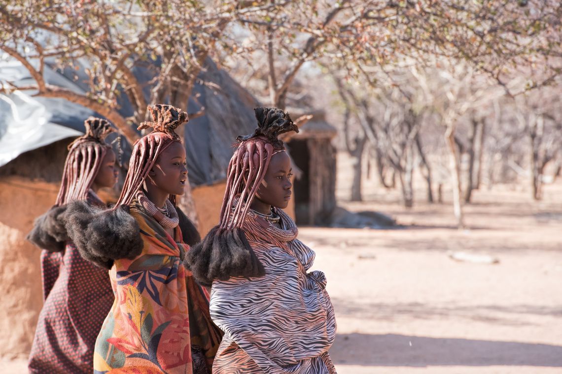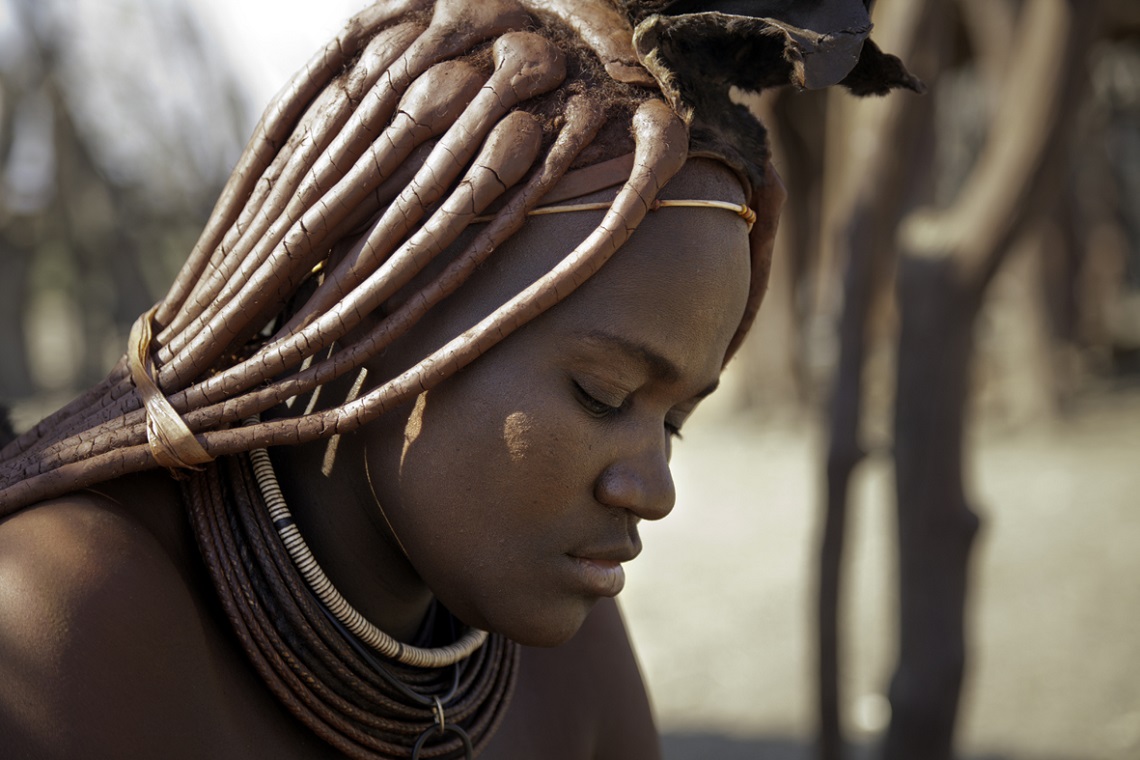 「美しい裸族」として知られるヒンバ族。女性は羊の皮で作った前掛け風のスカート、そして革や貝で作られた装身具だけを身に付けます。美容や日焼け防止のため、女性は動物の脂肪と赤石の粉末を混合したクリームを全身に塗り付けており、肌の美しさが印象的です。