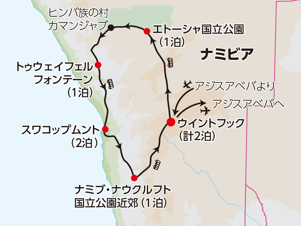 エトーシャ国立公園08:00発 カマンジャブ トゥウェイフェルフォンテーン18:30着