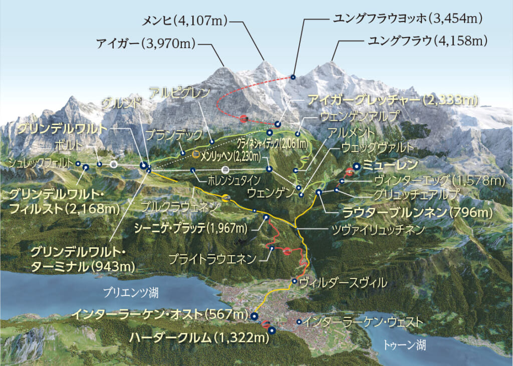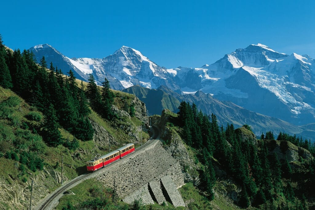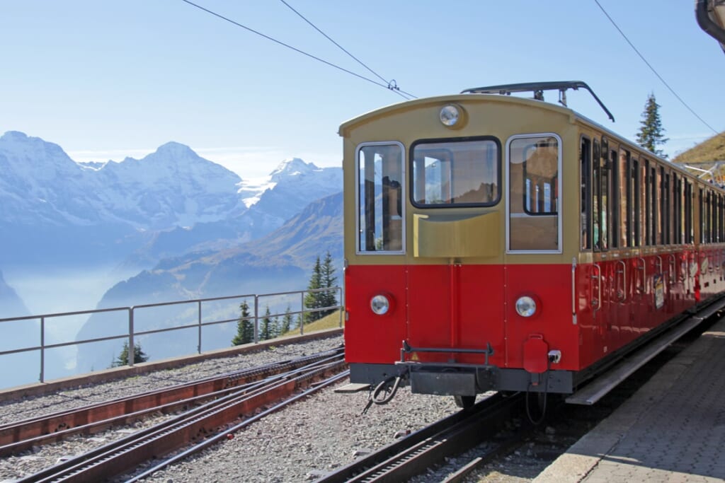 ベルナーオーバーラントの雄大な山岳風景を堪能できる列車が「シーニゲプラッテ鉄道」です。ヴィルダースヴィル駅から出発し、レトロな雰囲気を残す小さな赤い歯車式の列車が、標高差1,000メートル以上をゆっくりと登っていきます。車窓からは緑豊かな牧草地や伝統的な山小屋、そしてアルプスの大パノラマが広がります。標高約1,987メートルの終点シーニゲプラッテに到着すると、目の前にはアイガー・メンヒ・ユングフラウの三名峰がそびえ立ち、まさにスイスを象徴する壮麗な風景が眼前に広がります。山頂には高山植物園があり、季節ごとの花々を観賞できるのも楽しみのひとつです。