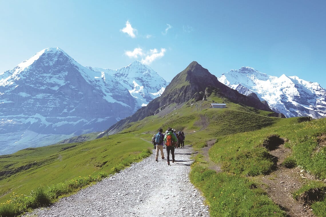 ユングフラウ三山に加え、グリンデルワルトの街やヴェッターホルン、シュレックホルンなどの絶景が続く、緩やかな下り坂が中心の人気ルートです。(約4.4km/所要時間・約2時間)
