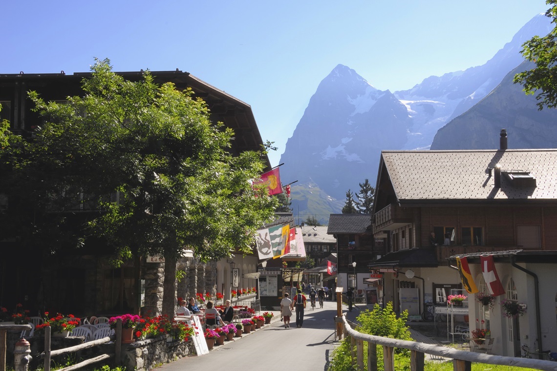 スイスを象徴する景観が凝縮し、夏には世界各国から観光客が訪れ賑わうユングフラウ地方。ミューレンもその中にありながら、観光客の喧騒から離れた静けさを守る特別な村です。ホテルの数も限られ、ガソリン車の乗り入れが禁止されているため、大型の団体旅行客は少なく、落ち着いた雰囲気の中で滞在できます。アルプス本来の雄大な自然と牧歌的な山村の風情に包まれながら過ごす時間は、ここでしか味わえない贅沢です。