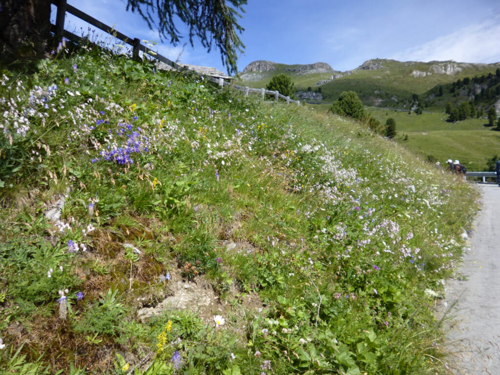 サン・モリッツからケーブルカーでチャンタレッラ駅まで行き、そこから正面に雄大な山々を見ながらほぼ平坦な道を歩く「ハイジ・フラワートレイル」が始まります。ここでは約200種の高山植物が観察できるよう整備され、この時期には美しい花々も楽しむことができます。ちなみに「ハイジ・フラワートレイル」という名前は、もともとこのコースの最後に「ハイジ」の撮影で使われた山小屋「ハイジヒュッテ」があったため、その名が付けられました。