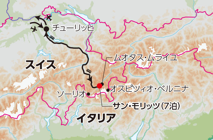 ■航空機を乗り換え、チューリッヒへ。 ■着後、バスにてエンガディン地方のサン・モリッツへ。 【7連泊】 (サン・モリッツ泊) |