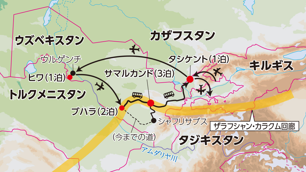 - サマルカンドは3連泊、ブハラは2連泊し、それぞれの町の魅力に迫ります。