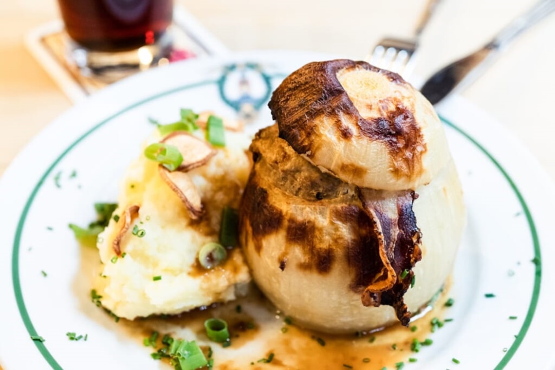 バンベルクの名物郷土料理は、玉葱にひき肉を詰めた郷土料理「バンベルガー・ツヴィーベル」。独自の伝統製法を継承するビールの町としても有名で、特にラオホ(燻製)ビールが特色です。郷土料理と合わせてお召し上がりください。