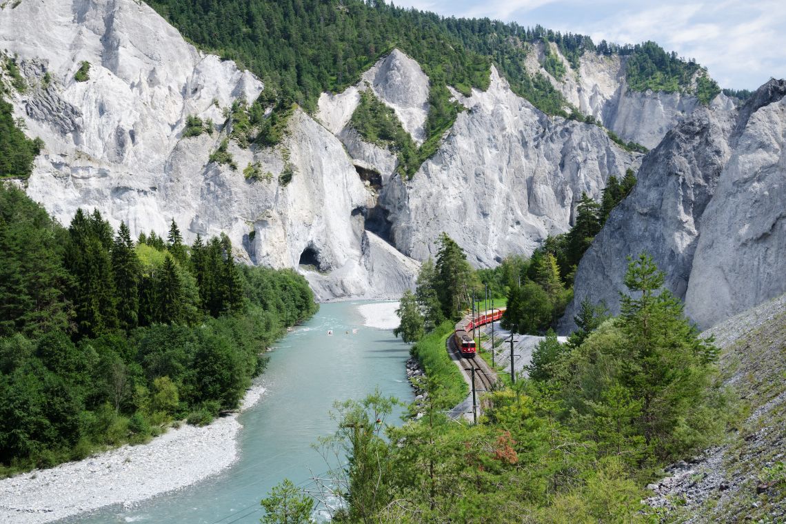 アンデルマットを出発し、氷河特急に乗ってクールへ。列車はゆっくりと標高を上げながらオーバーアルプ峠へ向かい、大きなパノラミックウィンドウに雄大な山並みが迫ります。峠を越えてクールへ下る途中には、「スイスのグランドキャニオン」と称されるライン峡谷が続き、深い渓谷とエメラルド色の川が織りなす美しい景観が車窓いっぱいに広がります。氷河特急ならではの絶景ルートをお楽しみください。