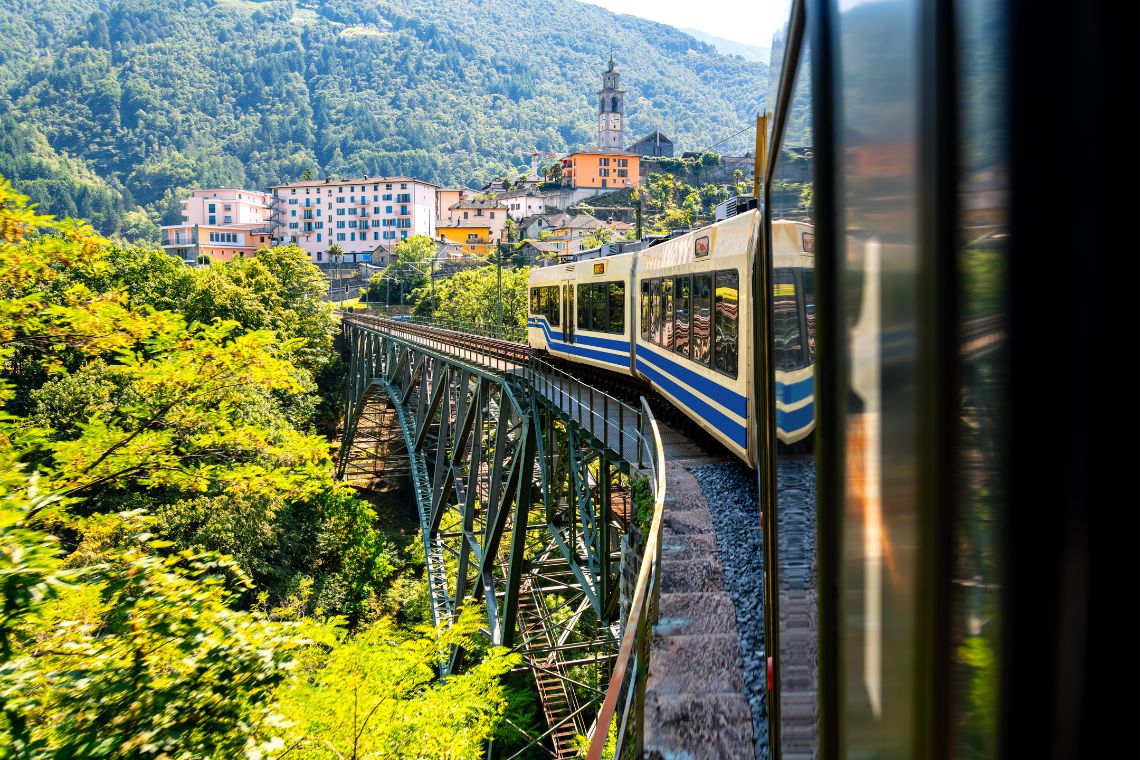 ロカルノからドモドッソラへ、百の谷を意味するチェントヴァッリ鉄道に乗車。深い渓谷や石造橋、小さな村を縫うように走る、南スイスとイタリアを結ぶ人気の絶景ルートです。