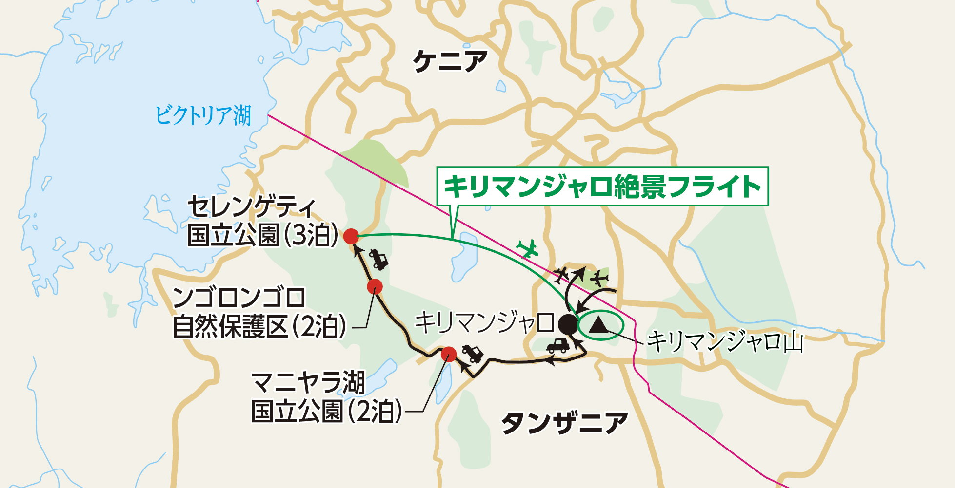 - アフリカ最高峰キリマンジャロの雄姿を望む遊覧飛行を楽しみます。(注2)