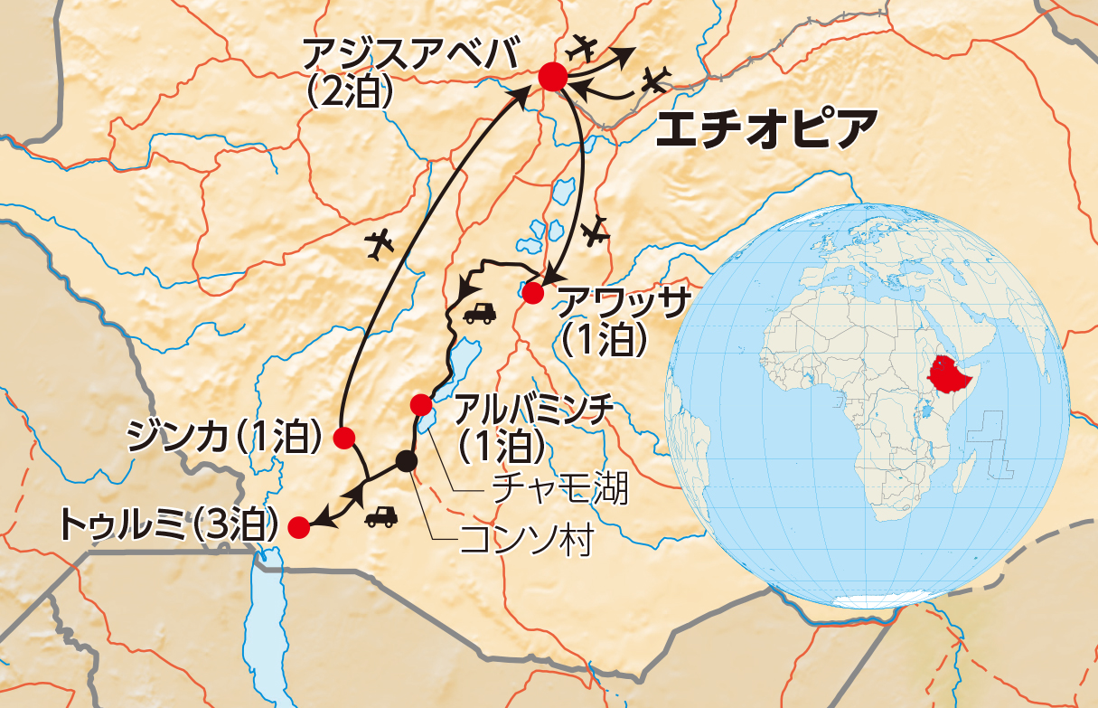 ■移動・行程に関して:南エチオピアでの移動には四輪駆動車を使用し、1台につき3名様を上限に分乗にてご案内します。万が一、車両に故障など問題が生じた場合には、一時的に詰めてご利用いただく場合がございます。 また、天候や道路状況、少数民族の村の都合等により、日程を入れ替えてご案内することがございます。