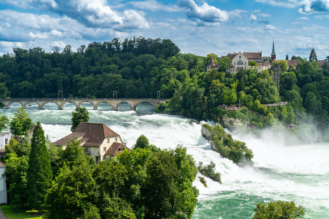 水量の多さではヨーロッパで最大。景勝地としても古くから世界的に有名な滝で、落差は23メートルとあまりありませんが、横幅は150メートルもあり、その大きさと迫力には圧倒されます。滝に近づくボート遊覧にご案内します。